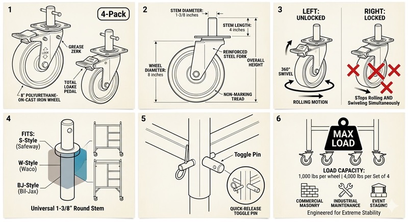 The 8 inch Scaffold Wheel, also known as Heavy Duty Caster, is the most common type of caster used on scaffolding casters for portable scaffolding towers. They provide the required ground clearance and load-bearing capacity required to move heavy scaffolding material safely.