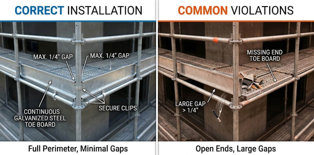 - Perimeter Coverage in Full: Toe boards must be put at every end and side that is open on the platform. Any openings in the perimeter can allow debris to fall out.