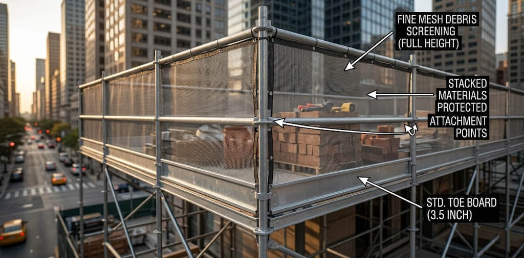 - Integration with Netting: In high-traffic urban areas, use toe boards and debris netting ("fans") together. The toe boards will stop the larger loads (i.e., heavy material dropping to the ground), and the netting will catch any smaller material (i.e., dust and particles).