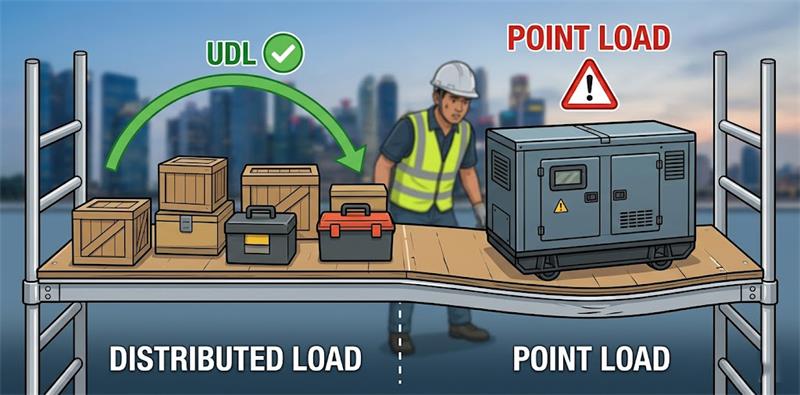 • A concentrated point load refers to an entire weight from a specific location on the structure, which will be deposited on one small area of the structure, i.e., a uniform weight that's placed at a specific location (a heavy bucket of mortar taken off-staging or a piece of machinery). Even though the weight may be below the uniformly distributed load (UDL) limit, a concentrated point load can still result in cracking the structure. Always distribute heavy materials on the structural transoms (horizontal support beams) and not on the center of the platform.